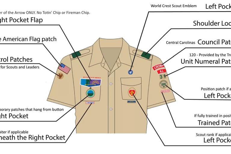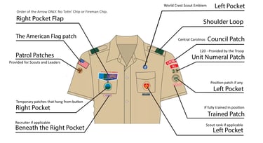 7. Uniform. If you are signing up to be an Assistant Scoutmaster, please purchase a Class A uniform. You can purchase this at Scoutshop online or at a local Scoutshop store where they will expertly help you. We provide Troop 120 numbers. You need scout shirt, green socks, green pants, green shoulder loops, scout belt, central carolinas patch, and these patches. We recommend going to a seamstress that knows Scouts, like Amiable Alterations. For more information on how to construct the shirt, see Scouts Guide to Insignia or review the image below for placement:
